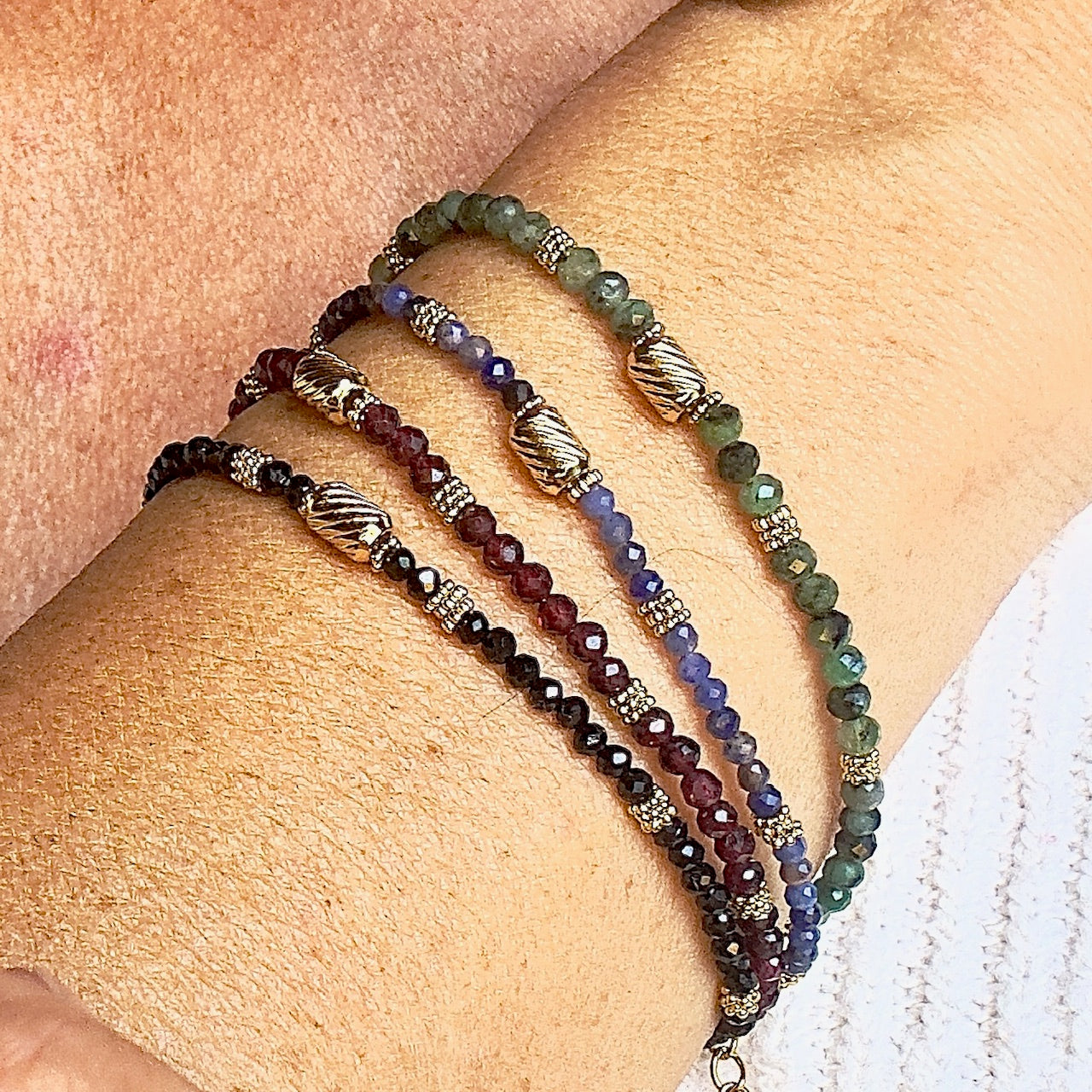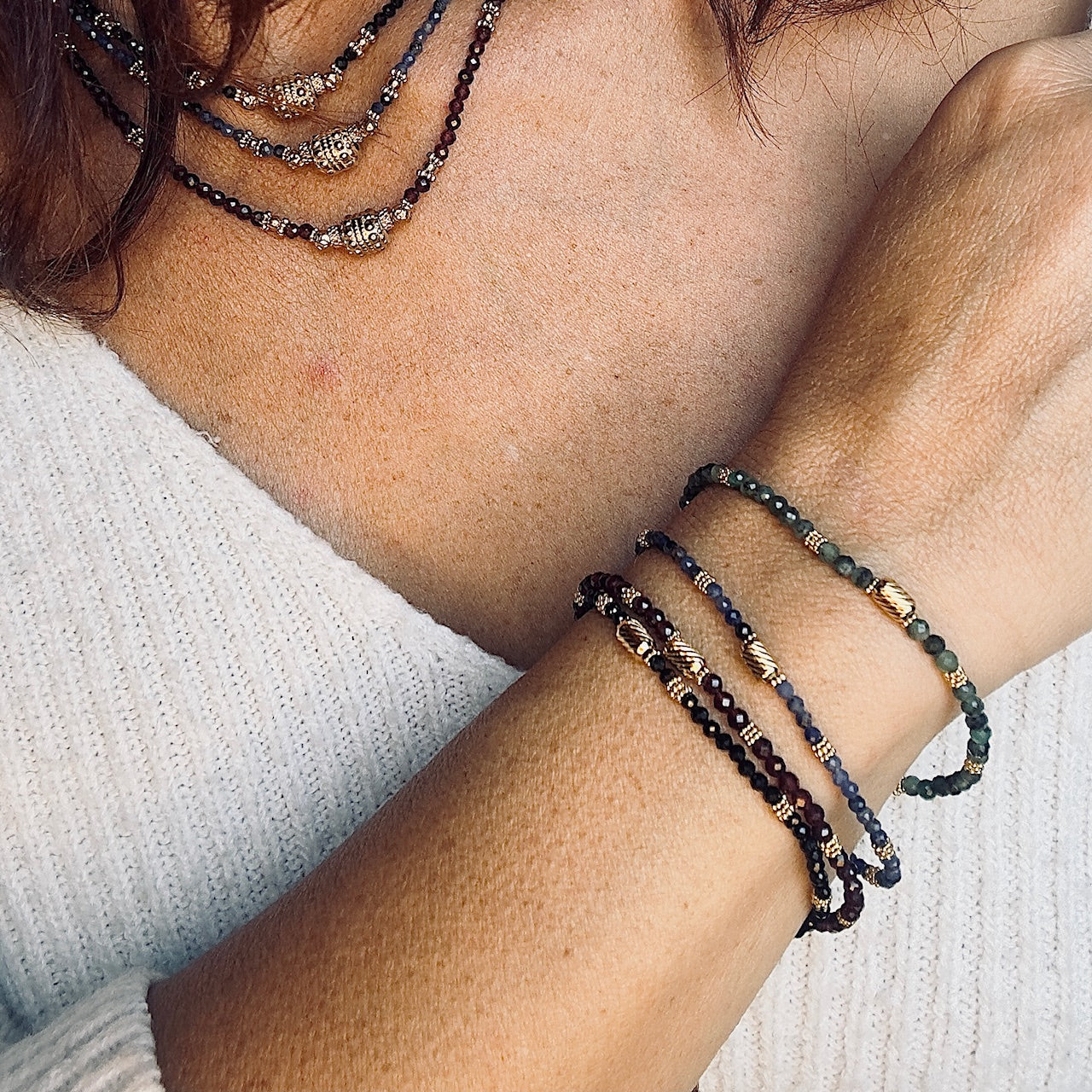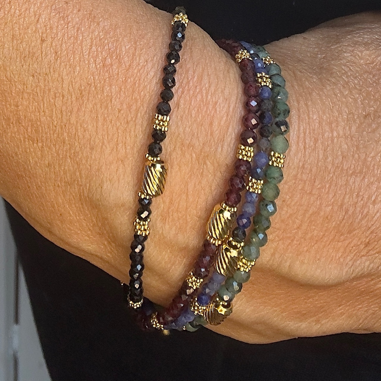 Bali: Ce magnifique bracelet d'inspiration balinaise apporte une touche d'éclat à vos tenues. Il se décline en quatre pierres différentes: Agate noir / grenat / émeraude et sodalite.
