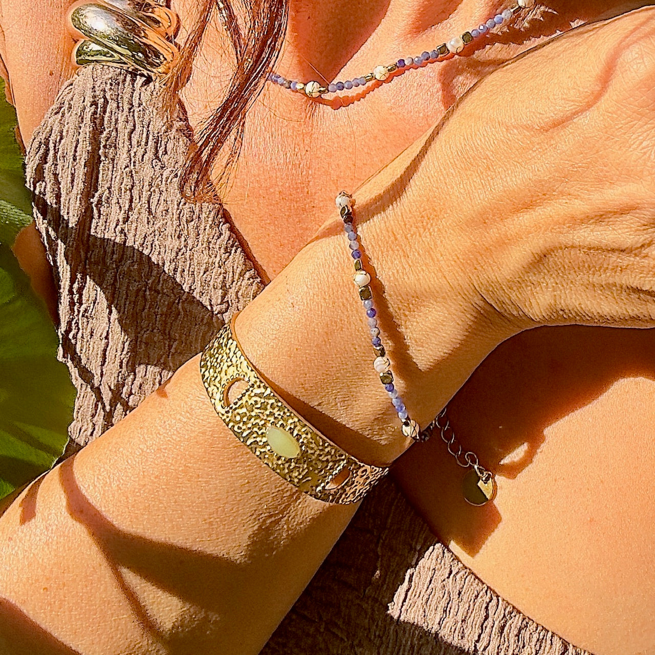 Mya: Ce bracelet est assemblé par mes soins dans mon atelier avec des perles en pierre naturelle facettées. Il existe en trois modèles différents: tourmaline/sodalite/grnenat