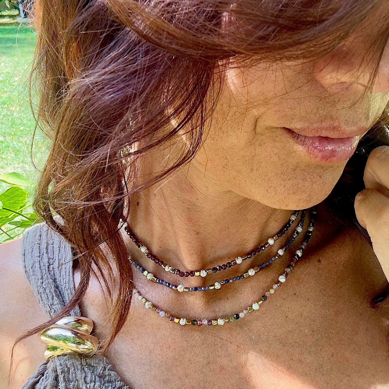Mya: Ce collier est assemblé par mes soins dans mon atelier avec des perles en pierre naturelle facettées. Il existe en trois modèles différents: tourmaline/sodalite/grnenat