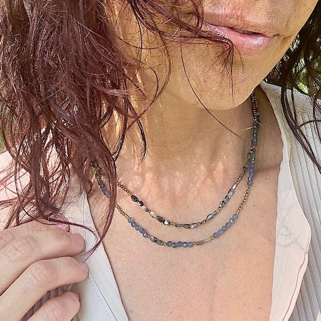 Nina : Ce collier double rang est assemblé avec des perles en saphir bleu et jaune ainsi que de perles en saphir bleu facettées ainsi que des perles en hématite dorée. Le saphir est bleu et jaune car il n'est pas "pure", ce qui le rend d'autant plus magnifique.