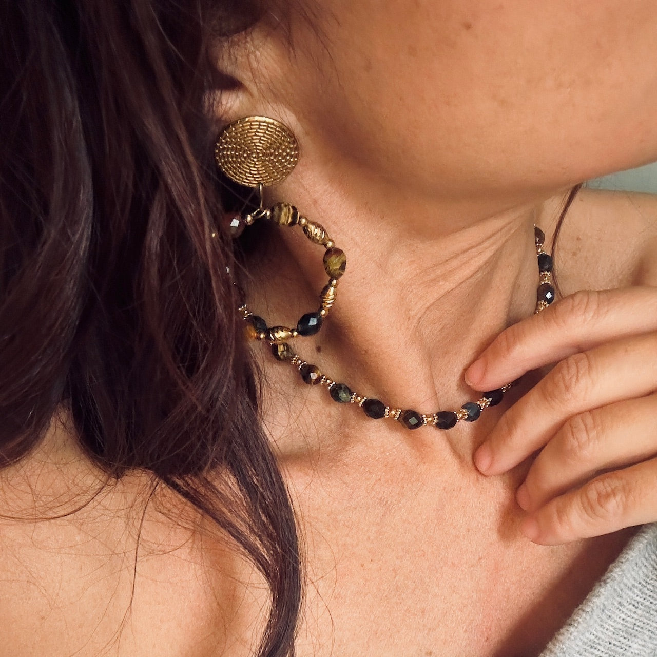 Nora: Sublimez votre allure avec ce collier unique en œil de tigre ou agate indienne et acier inoxydable doré. Ses reflets chauds évoquent la confiance en soi et l’élégance naturelle. Une pièce unique, féminine et intemporelle, parfaite pour compléter une tenue avec style.