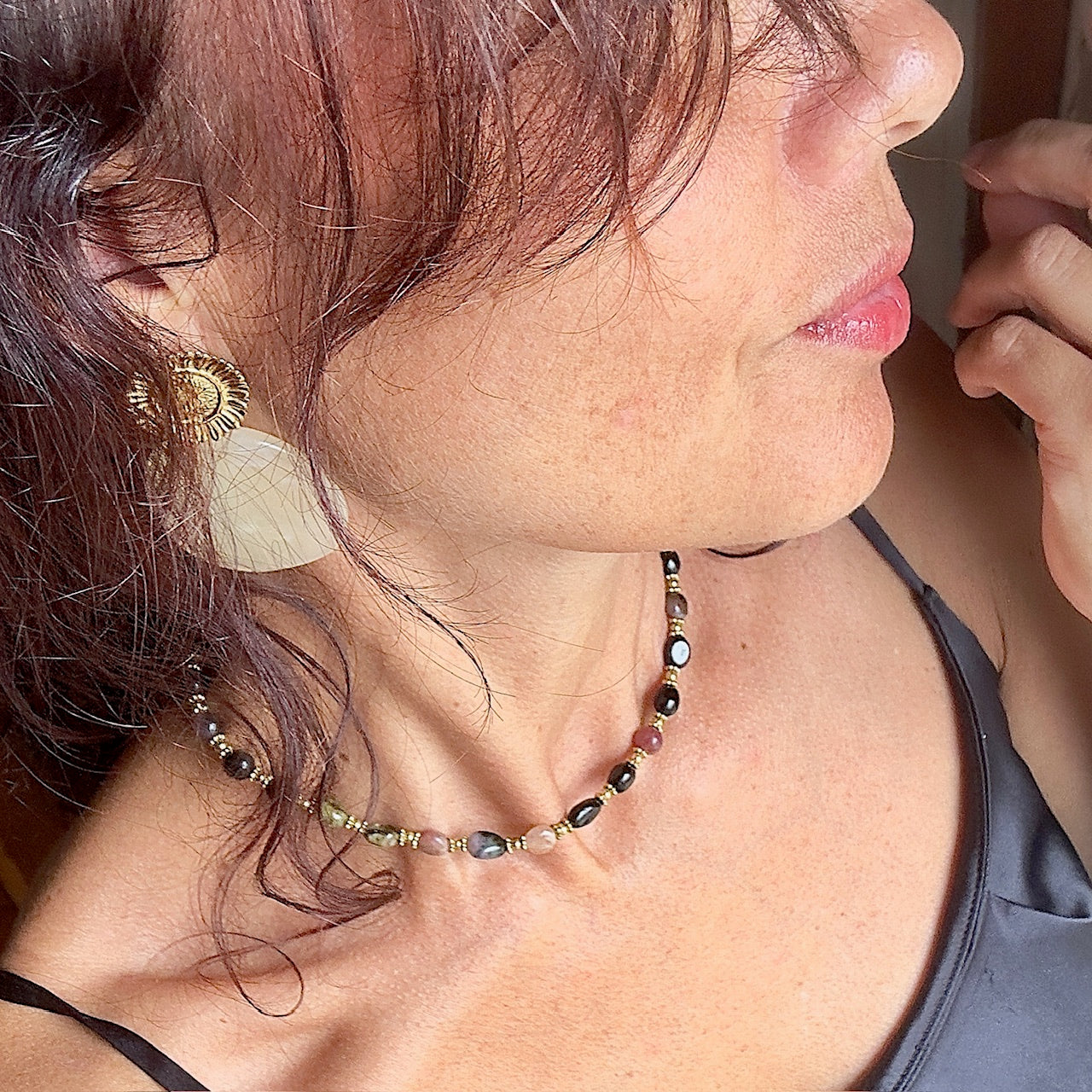 Olie: Ce collier majestueux est réalisé en perle de pierre naturelle en tourmaline. Il assure un port de tête élégant qui ne laisse pas indifférent.