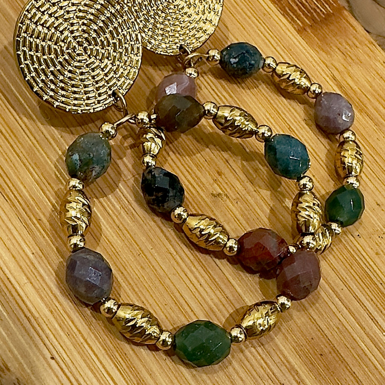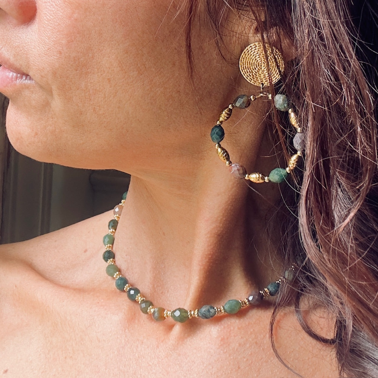 Nora: Ces créoles en agate indienne ou oeil de tigre et acier inoxydable doré incarnent l’élégance bohème chic. Chaque pierre naturelle révèle des nuances uniques pour un bijou féminin et authentique. Une pièce indispensable pour accessoiriser une tenue et affirmer sa confiance en soi avec style.