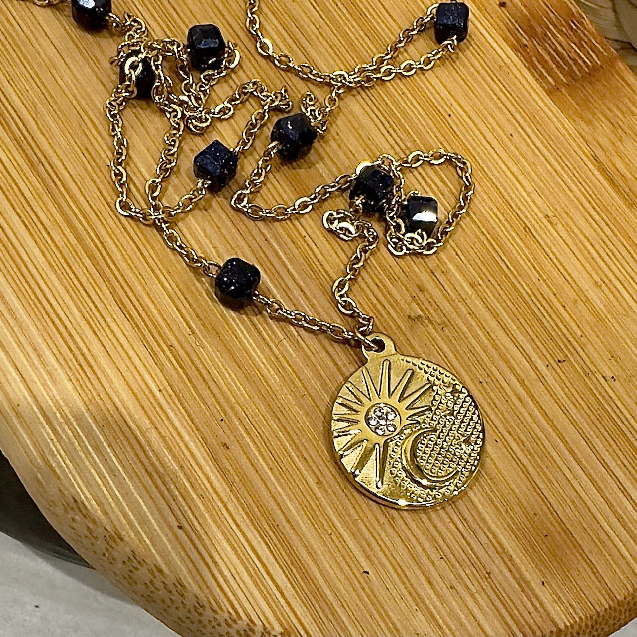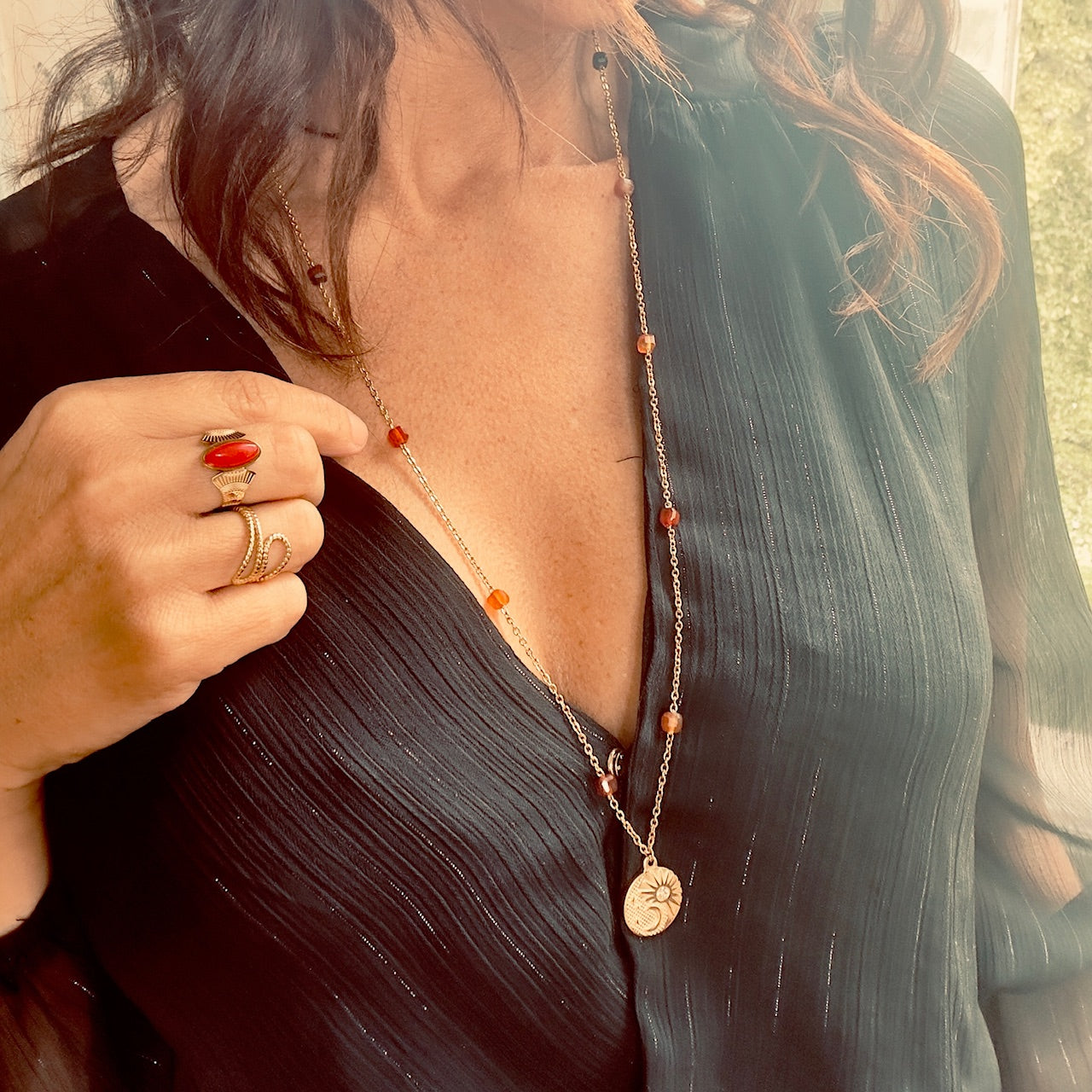 Spirit: Ce sautoir en agate rouge ou sable bleu et acier inoxydable doré séduit par son pendentif lumineux représentant la lune et le soleil. Fin et élégant, il mêle énergie spirituelle et raffinement intemporel. Un bijou unique qui symbolise l’équilibre et sublime chaque tenue avec une touche de mystère et de féminité.